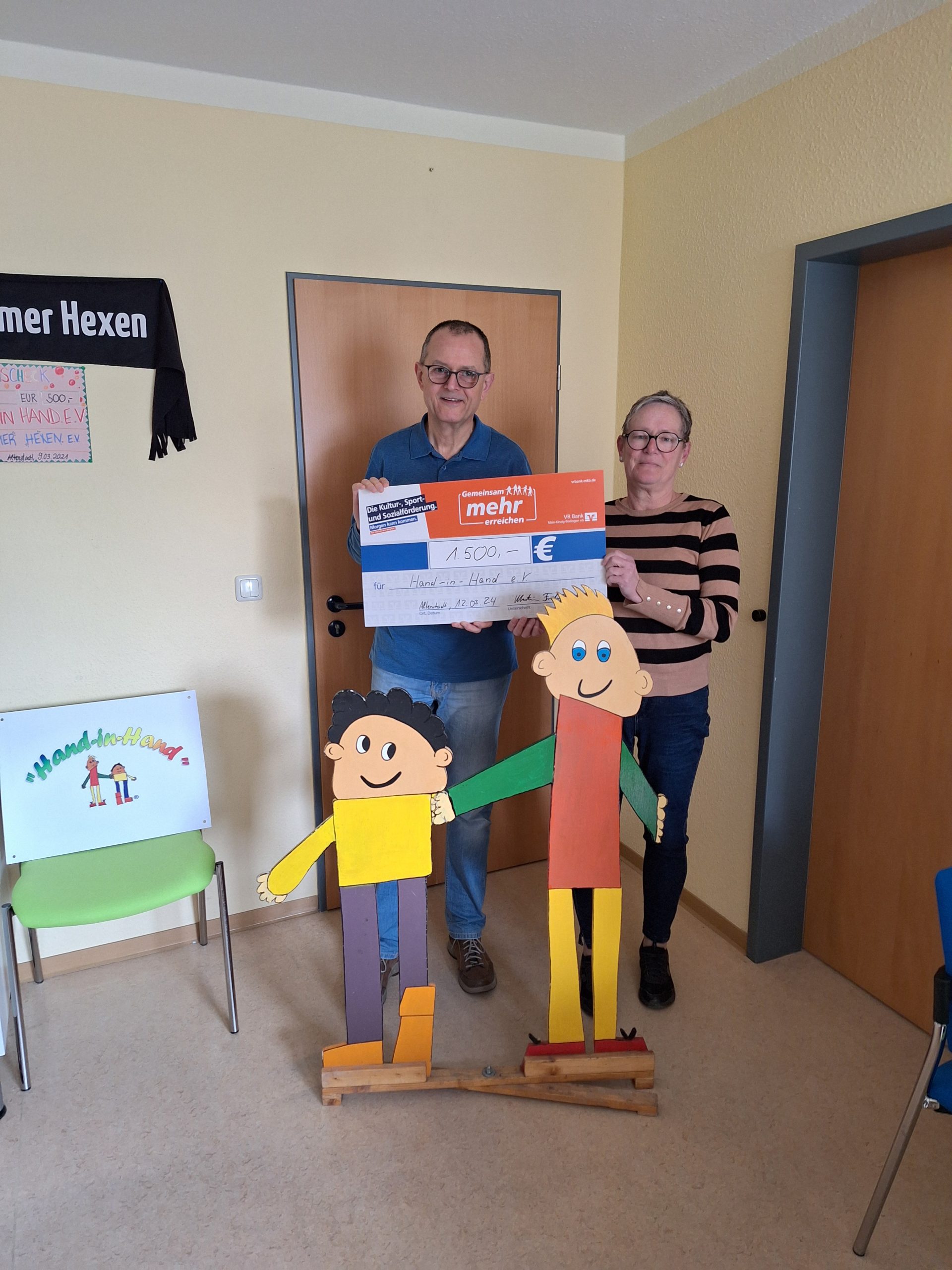 Florian Arndt, Bereichsdirektor Firmenkunden & Immobilien (links) der VR Bank Main-Kinzig-Büdingen und Rainer Lapp, Vorsitzender des Vereins Hand-in-Hand für schwerst-und krebskranke Kinder freuen sich über das hohe Spendenaufkommen. Arndt überreichte kürzlich einen Scheck in Höhe von 7 500 Euro. Die Spende wurde von der VR-Bank zu bereits bestehenden Spenden ergänzt. „Wir bedanken uns bei der VR-Bank herzlich für die tolle Unterstützung unserer Arbeit“, sagte Vorsitzender Rainer Lapp. Mit der Hausbank des Vereins bestehe seit Jahren eine gute Zusammenarbeit.