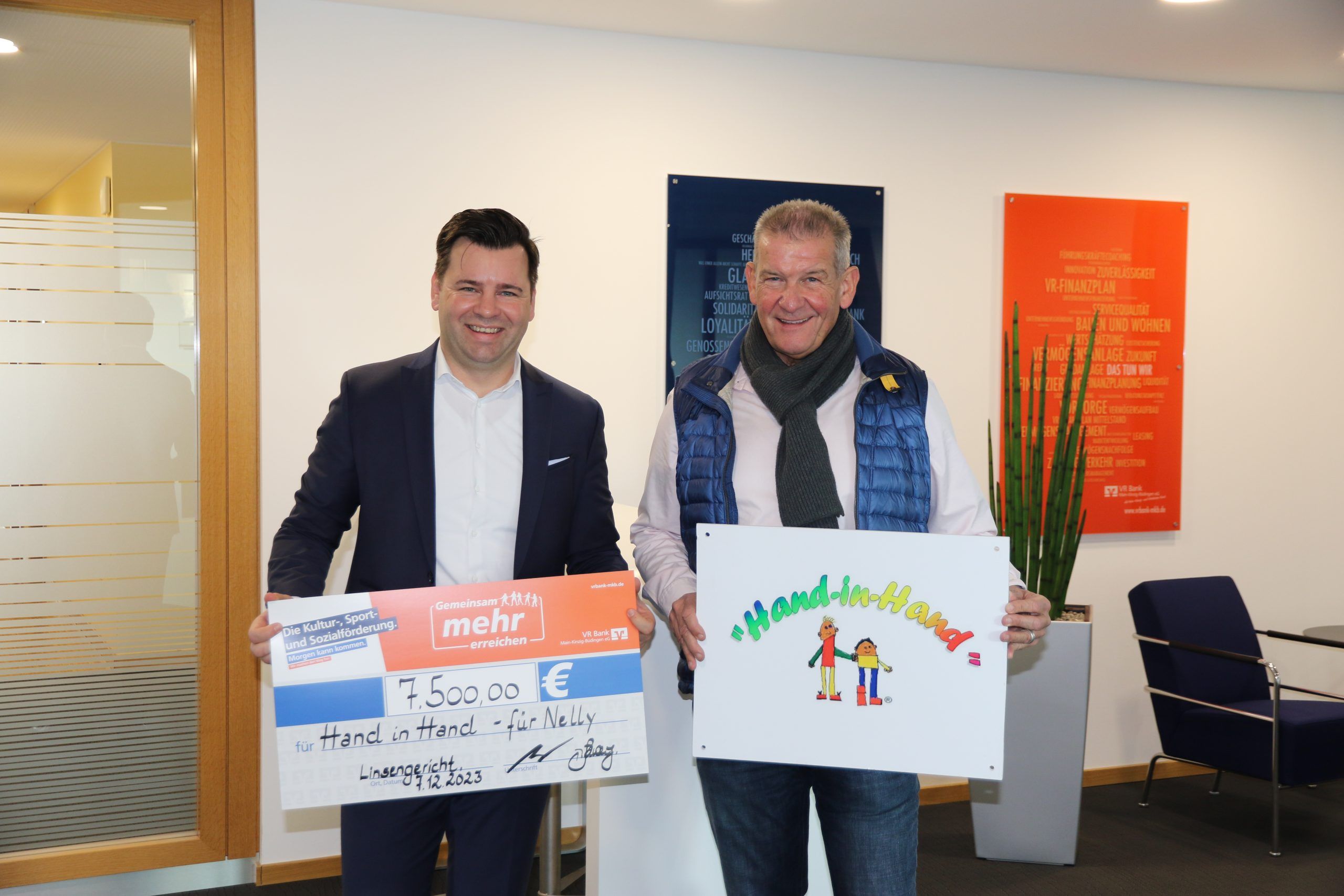 Florian Arndt, Bereichsdirektor Firmenkunden & Immobilien (links) der VR Bank Main-Kinzig-Büdingen und Rainer Lapp, Vorsitzender des Vereins Hand-in-Hand für schwerst-und krebskranke Kinder freuen sich über das hohe Spendenaufkommen. Arndt überreichte kürzlich einen Scheck in Höhe von 7 500 Euro. Die Spende wurde von der VR-Bank zu bereits bestehenden Spenden ergänzt. „Wir bedanken uns bei der VR-Bank herzlich für die tolle Unterstützung unserer Arbeit“, sagte Vorsitzender Rainer Lapp. Mit der Hausbank des Vereins bestehe seit Jahren eine gute Zusammenarbeit.