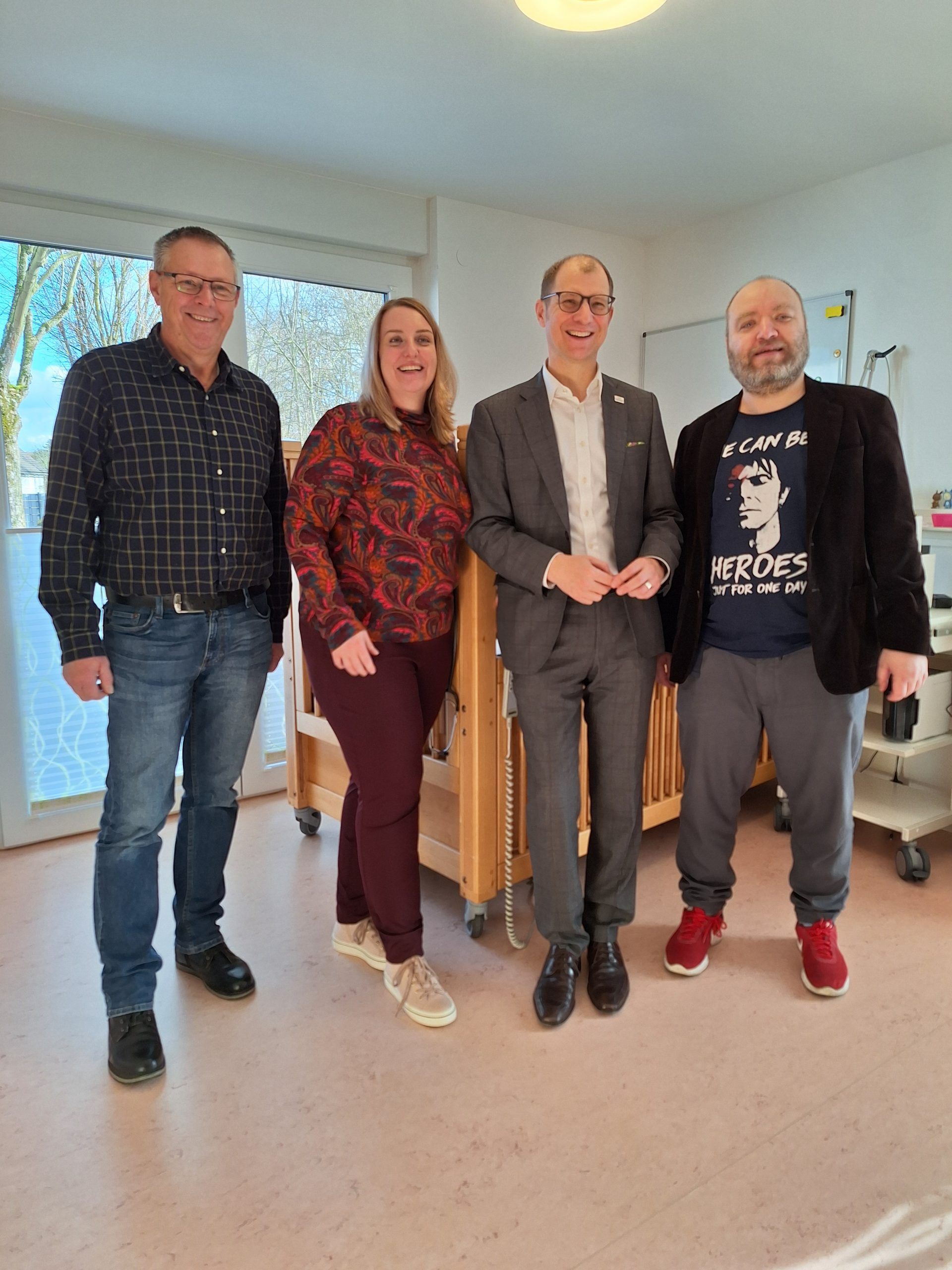 Foto (v.l.n.r): Edwin Knickel (stellv. Vorsitzender HiH), Nina Jäger (2. Vorsitzende von Atemzeit e.V.), Jan Weckler (Landrat des Wetteraukreises), Sven Schöning (Geschäftsführer HiH) in einem Versorgungszimmer des Haus Atemzeit.
