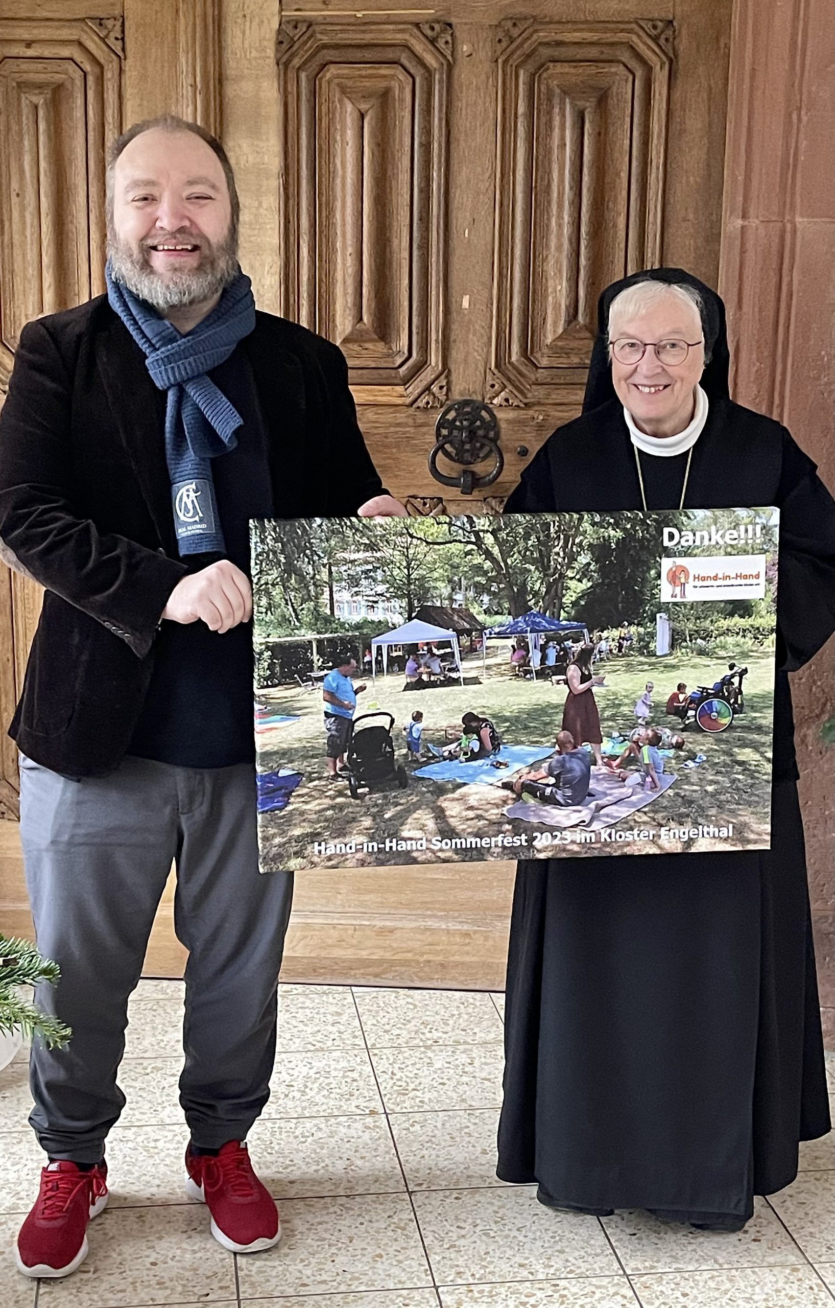 Kurz vor Weihnachten besuchten wir das Kloster Engelthal und hatten ein schönes Gespräch mit Äbtissin Elisabeth Kralemann. Neben dem regelmäßigen Austausch ging es vor allem darum, Danke für die tolle Unterstützung unserer Arbeit zu sagen! Als Erinnerung an das Hand-in-Hand-Sommerfest mit den kranken Kindern und ihren Familien übergab Geschäftsführer Sven Schöning ein Bild als Erinnerung an die gelungene Veranstaltung im Gästegarten des Klosters.