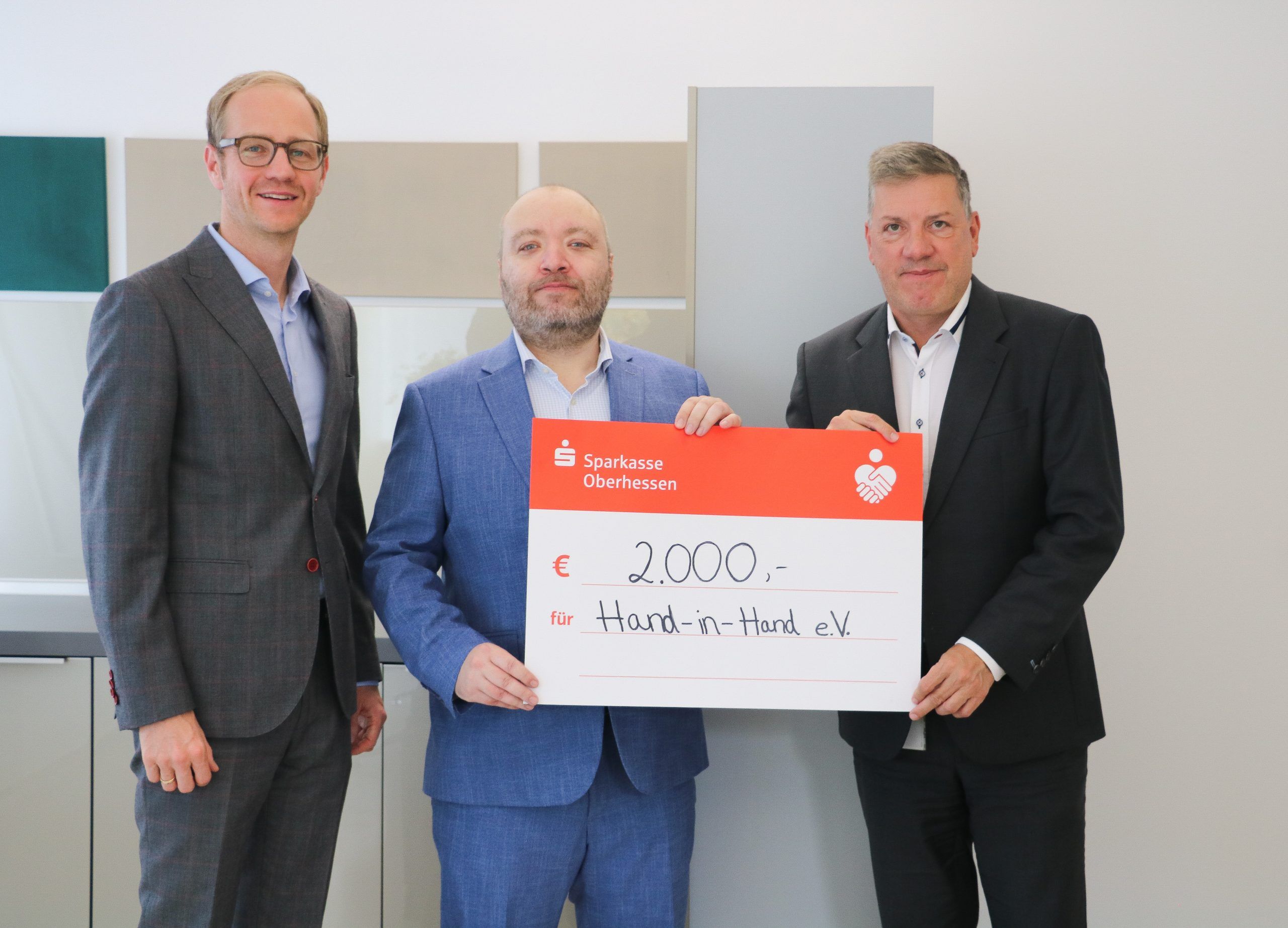 Diese Mitarbeiterinnen und Mitarbeiter nahmen hausintern am sogenannten „Restcent“-Programm „Null-Komma-Viel“ teil, bei dem die Cent-Beträge der Netto-Bezüge gespendet werden. Dabei kam die schöne Summe von 2.000 Euro zusammen, die Hand-in-Hand zugutekommt.