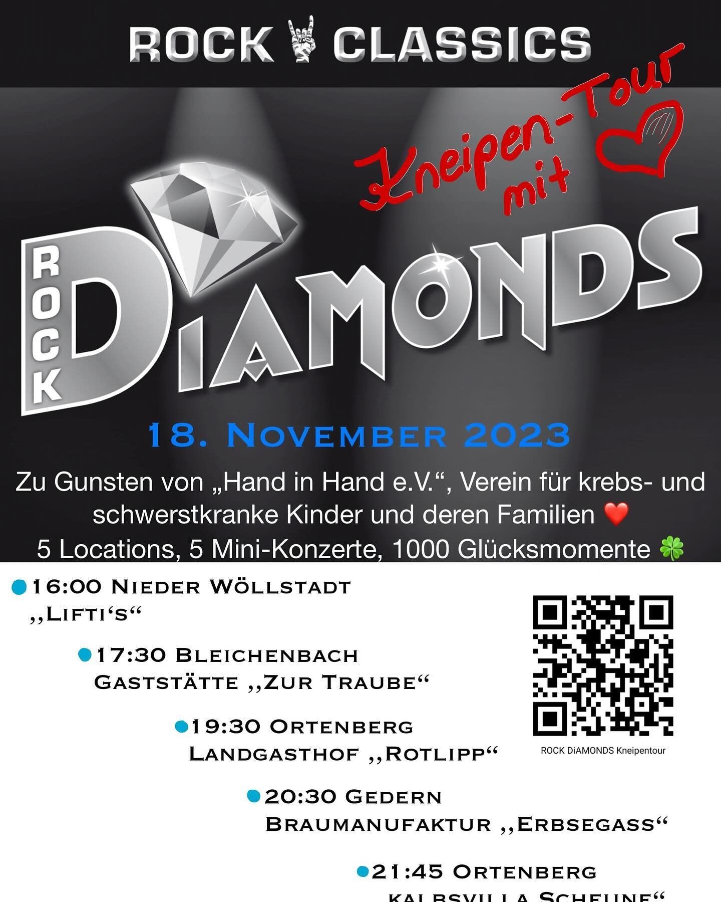 Denn das Ganze läuft – wie im letzten Jahr – auf Spendenbasis zu Gunsten unseres Vereins. Und wir sind alle hochmotiviert, die Summe des letzten Jahres noch zu toppen! Also kommt mit, zu den 5 Mini-Konzerten in 5 „Kneipen“-Locations mit 1.000 Glücksmomenten. Ob zu einzelnen Auftritten, dem Finale in der Kalbsvilla Ortenberg oder auf der gesamten Tour, wir freuen uns über Eure Teilnahme! Was wir versprechen können ist großer Spaß, gute Laune und super Musik. Die einzelnen Kneipen und Zeiten entnehmt Ihr bitte dem Plakat. Wir sehen uns! Schon jetzt bedanken wir uns bei der Band „Rock Diamond“ für ihr Engagement und freuen uns sehr, dass wir erneut die Begünstigten ihrer tollen Idee sind.
