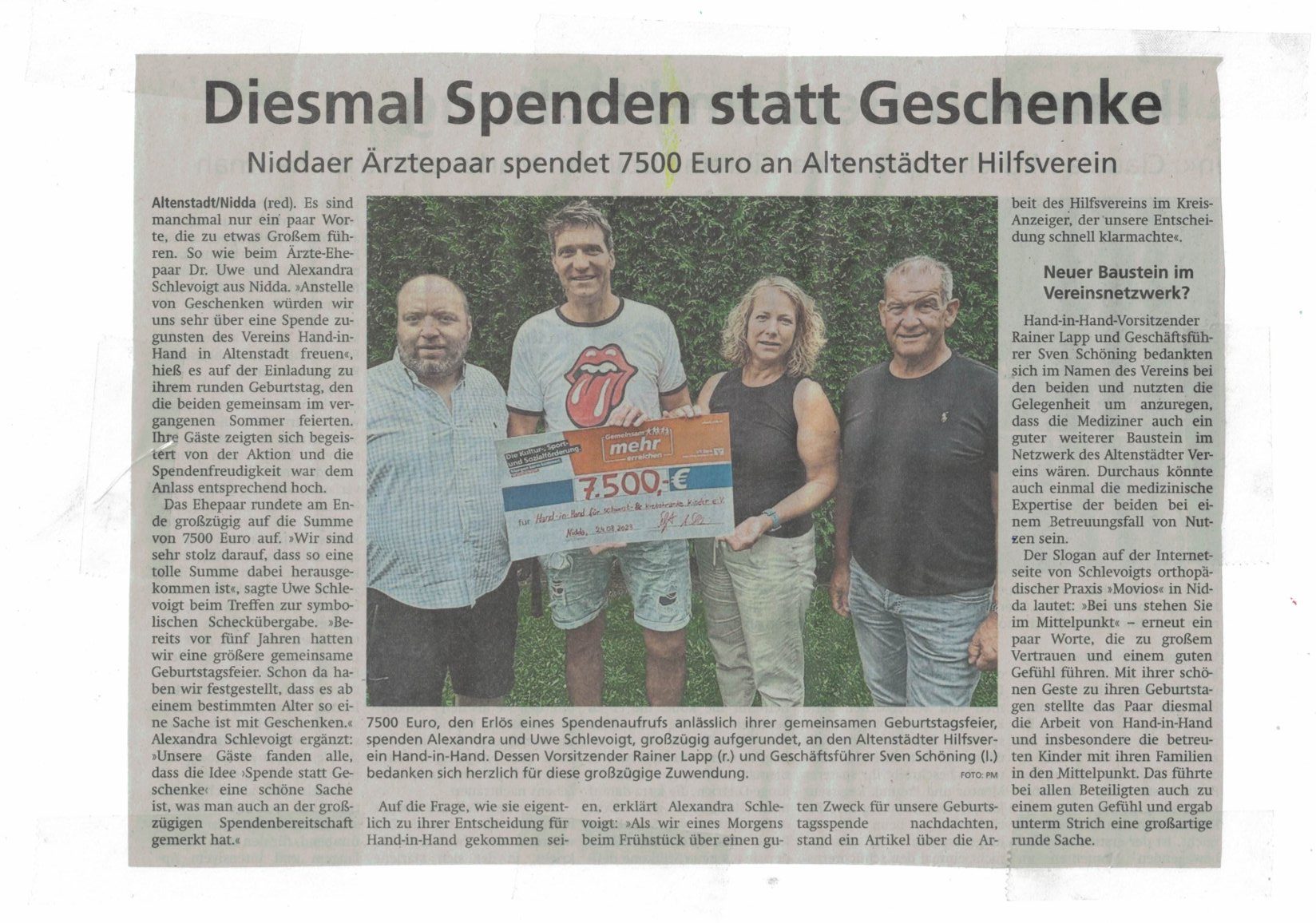 Anlässlich ihrer diamantenen Hochzeit hat das Ehepaar Schäfer um Spenden für den Verein Hand-in-Hand gebeten. Geschenke wollten Sie nicht, denn in ihrem Alter hat man doch alles, so Frau Schäfer. Familie Schäfer verfolgt unsere Arbeit schon lang und möchte als gutes Beispiel voran gehen und andere Menschen zum Spenden bewegen. Sie freuen sich, dass wir das Geld den Kindern zugute kommen lassen und werden es bei den anstehenden runden Geburtstagen wieder so machen. Eine sehr nette Begegnung mit einem sehr netten Ehepaar. ![]()