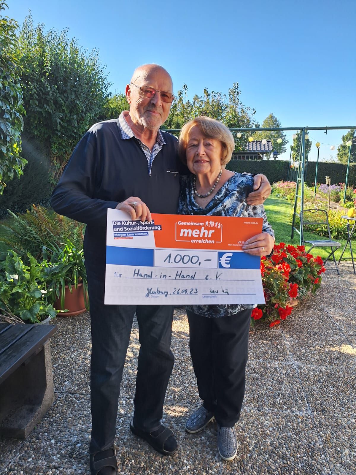 Anlässlich ihrer diamantenen Hochzeit hat das Ehepaar Schäfer um Spenden für den Verein Hand-in-Hand gebeten. Geschenke wollten Sie nicht, denn in ihrem Alter hat man doch alles, so Frau Schäfer. Familie Schäfer verfolgt unsere Arbeit schon lang und möchte als gutes Beispiel voran gehen und andere Menschen zum Spenden bewegen. Sie freuen sich, dass wir das Geld den Kindern zugute kommen lassen und werden es bei den anstehenden runden Geburtstagen wieder so machen. Eine sehr nette Begegnung mit einem sehr netten Ehepaar. ![]()